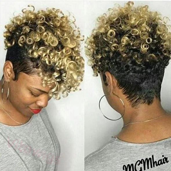 Black Gold Short Pixed Cut Spiral Curly Tapered Wig With Bang