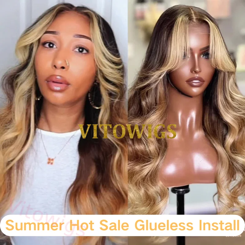 Glueless Highlight Brown Mixed Gold Long Body Wavy Hair Wig